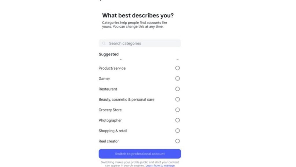अगर आप Blogger, Digital Creator, Business, Education जैसी categories में से अपने content create करते है to दी गई list मे अपने content के हिसाब से category choose करिये या business के लिए instagram account बनाया है तो उस हिसाब से सही category choose करिये।