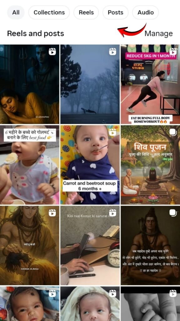 Step 5 यहाँ आपको सभी saved की गई Reels, Post, Audio देख जायगी अगर आप ने collection बनाये है तो वह भी देख जायेगे.
