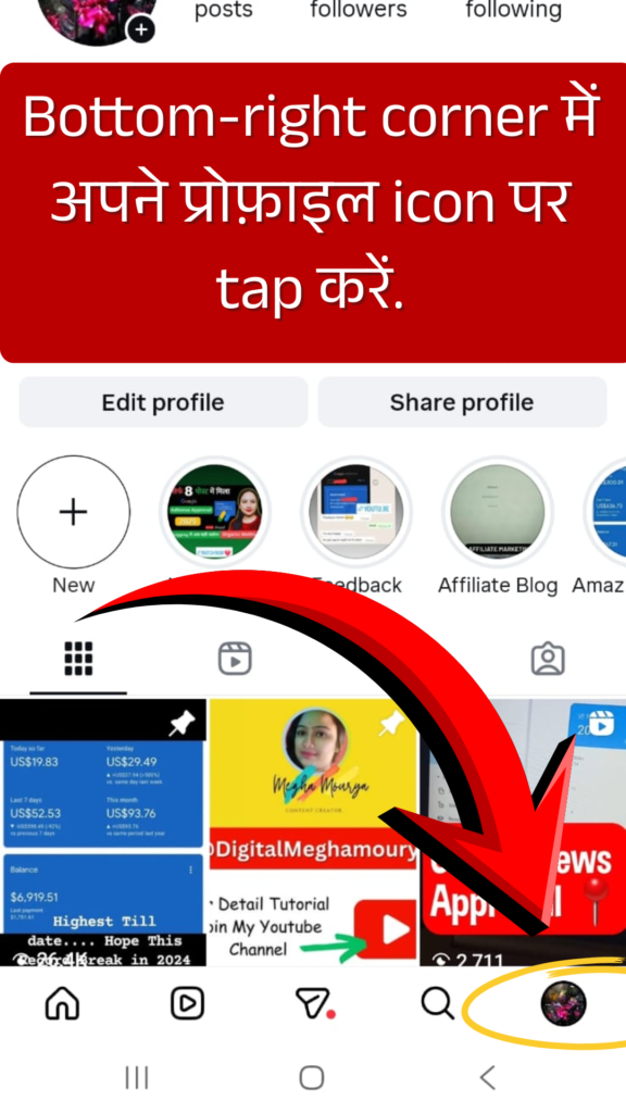 Step 2. Instagram पर आने के बाद Bottom-right corner में अपने प्रोफ़ाइल icon पर tap करें.